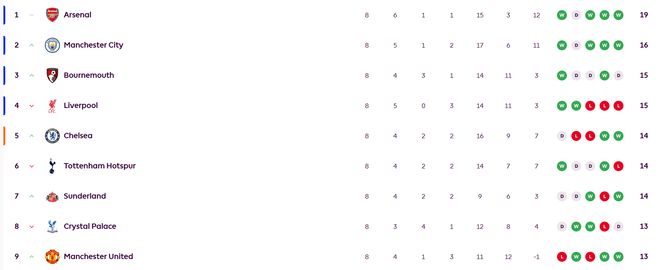 英超最新积分榜方面,阿森纳8轮6胜1平1分以19分领跑,曼城16分第二落后枪手3分。利物浦各项赛事遭遇四连败,其中英超三连败,已经从榜首跌至第四。伯恩茅斯和红军同积15分,排在第3。曼联全取三分后攀升至第9的位置。